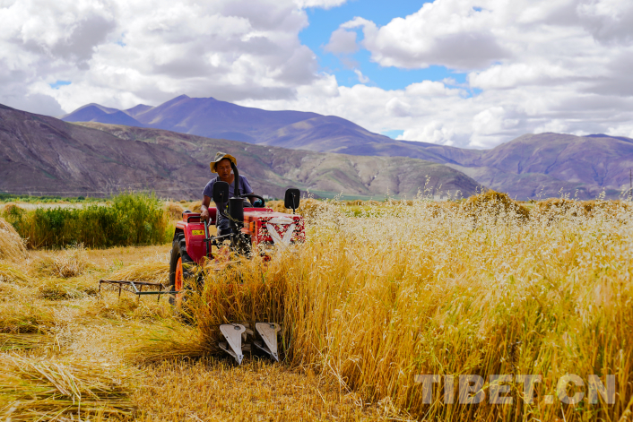 飄香的秋日一片金黃,一臺臺收割機正在青稞田里往來穿梭。2023年,西藏青稞產(chǎn)量達84.36萬噸,播種面積達222.87萬畝,累計建成高標準農(nóng)田430萬畝,青稞良種覆蓋率達到93%,主要糧食作物耕種收綜合機械化率達到71%以上。