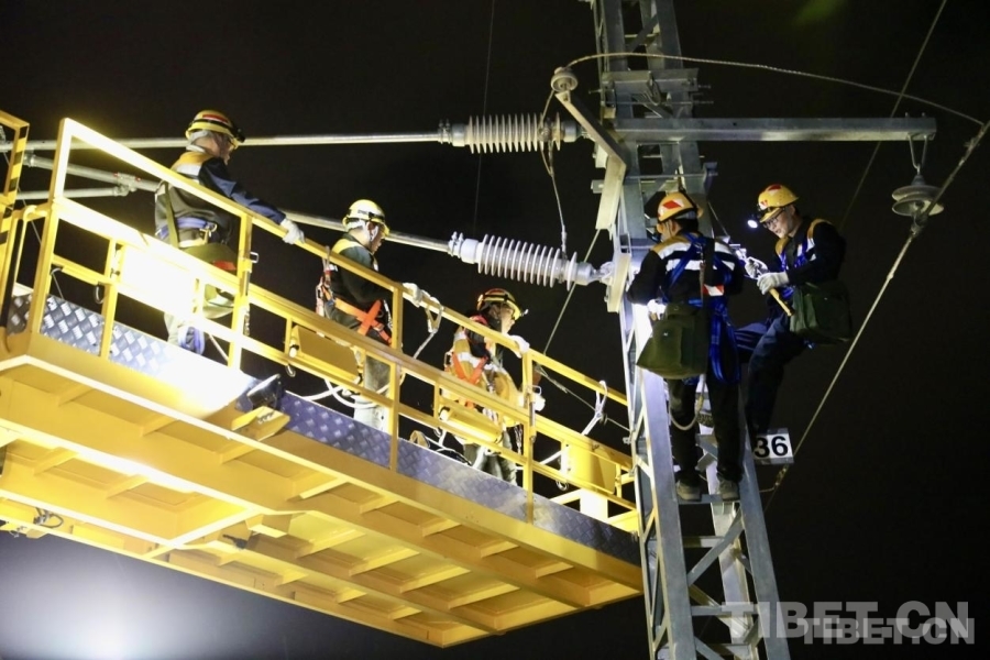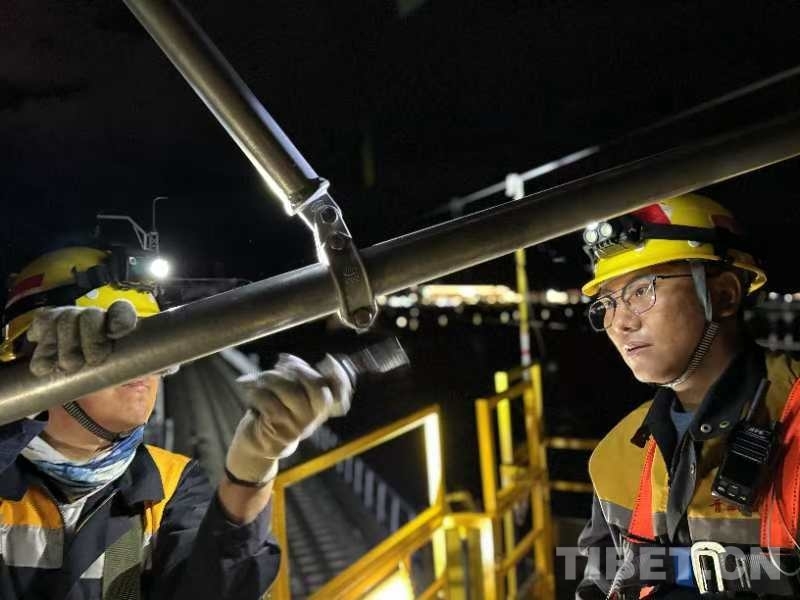 23時00分,軌道車穩(wěn)穩(wěn)停靠,“天窗”作業(yè)命令下達(dá)。中國鐵路青藏集團(tuán)有限公司拉薩基礎(chǔ)設(shè)施段供電維修技術(shù)中心拉薩南接觸網(wǎng)維修隊工長李積王帶著7名工友走下接觸網(wǎng)作業(yè)車,驗(yàn)電、連接地線端、接掛地線……一系列操作一氣呵成。隨即,現(xiàn)場負(fù)責(zé)人拉加和工友們依次登上距離地面6米高的作業(yè)平臺上,穿梭于接觸網(wǎng)線索之間,猶如凌空“舞者”。