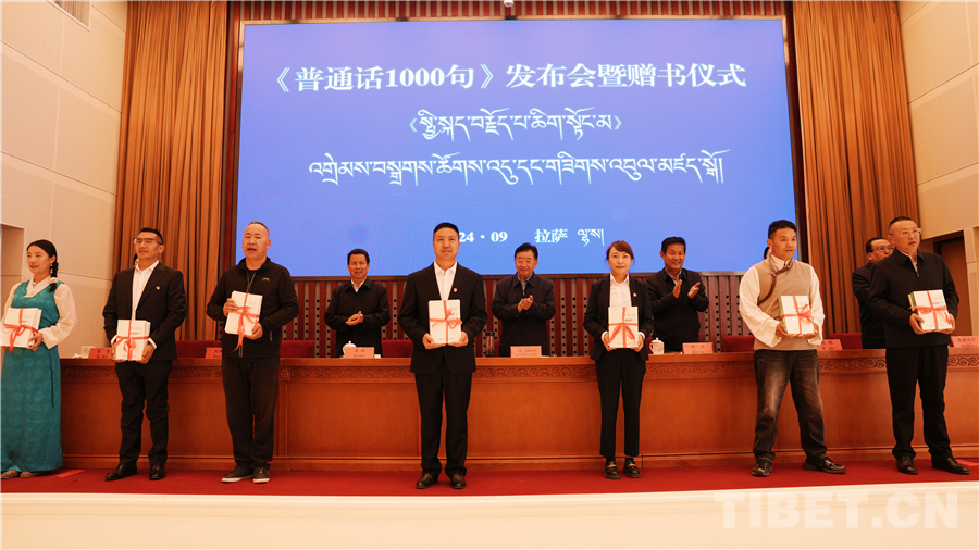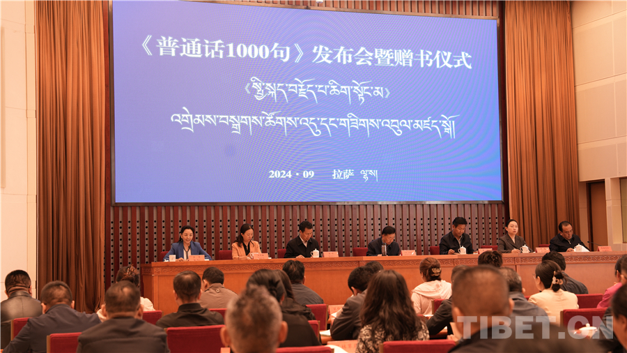 中國西藏網(wǎng)訊 為進(jìn)一步助力國家通用語言文字推廣普及,鑄牢中華民族共同體意識(shí)。9月20日,西藏自治區(qū)藏語委辦(編譯局)在拉薩舉行了《普通話1000句》漢藏對(duì)照版新書發(fā)布會(huì)暨贈(zèng)書儀式。西藏自治區(qū)政府副主席、自治區(qū)藏語委副主任甲熱·洛桑丹增出席會(huì)議,西藏自治區(qū)藏語委辦(編譯局)黨組副書記、主任(局長(zhǎng))達(dá)娃次仁作新書出版介紹,會(huì)上宣讀了教育部語文出版社發(fā)來的賀信,并向與會(huì)代表贈(zèng)書。