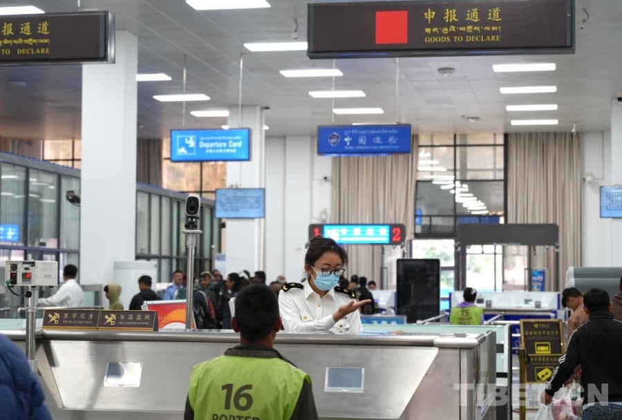 圖為吉隆口岸移民管理警察正在驗(yàn)放出境旅客