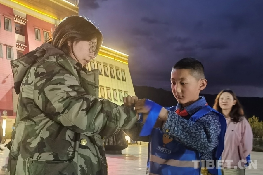 夜幕降臨,研學(xué)游團(tuán)隊來到文成公主劇場。穿上藍(lán)馬甲,孩子們搖身一變成了文明旅游的小小宣傳員。帕里鎮(zhèn)小學(xué)注重培養(yǎng)學(xué)生的生態(tài)文明意識,自2023年7月起,主動加入“美麗公約”志愿組織的“擦亮天路行動”。學(xué)生定期在帕里鎮(zhèn)清理垃圾,也會為沿國道562來到帕里的游客宣傳垃圾隨身走的文明旅游理念。今天,來到拉薩,孩子們再次熟練地向劇場周圍的觀眾宣傳起來,一邊為大家在右臂系上代表文明旅游承諾的藍(lán)絲帶,一邊鼓勵“一起守護(hù)第三極,因?yàn)橛心?,中國更美”?/span>一時間,文成公主劇場周圍成為了藍(lán)絲帶的海洋。