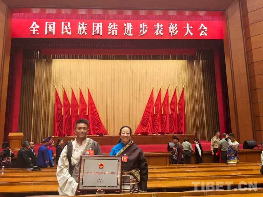 圖為全國民族團(tuán)結(jié)進(jìn)步模范集體代表頓珠才嘎與全國民族團(tuán)結(jié)進(jìn)步模范個(gè)人獲得者次仁拉姆
