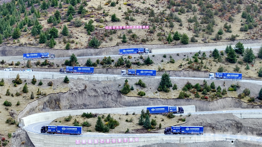 圖為中遠海運集團2024年援建的西藏自治區(qū)昌都市洛隆縣臘久鄉(xiāng)第一小學(xué)集裝箱食堂正運輸行駛在國道G349等道路上