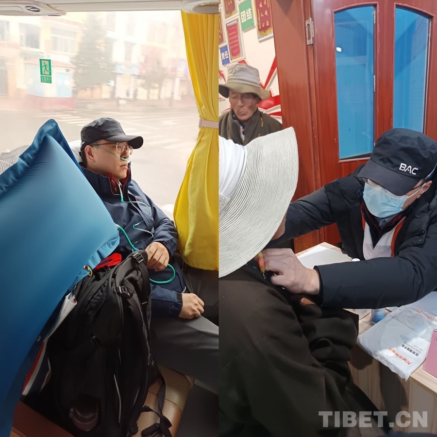 圖為前一晚抵達(dá)紅原時發(fā)燒38度的航天總醫(yī)院普外科專家蘇超云帶病前去義診(左),為當(dāng)?shù)厝罕娍丛\(右)攝影:賈春玲