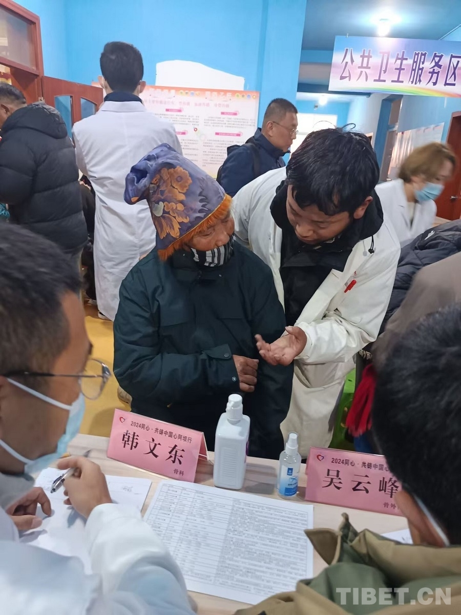圖為中國康復(fù)研究中心骨科專家唐鵬為當(dāng)?shù)厝罕娍丛\ 攝影:賈春玲
