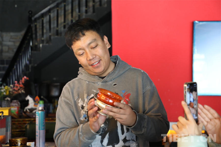 在濃郁的咖啡液里注入青稞奶,撒上當?shù)禺a的酸酸的奶渣和青稞?!煌胂銤獾目Х韧瓿闪恕J堑?,是“一碗咖啡”,索朗群培專門選用了藏族群眾喜愛的傳統(tǒng)木碗用作咖啡杯。