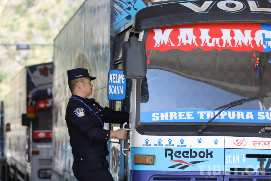 圖為10月29日,吉隆出入境邊防檢查站民警正在檢查出境尼泊爾貨車 攝影:肖富貴
