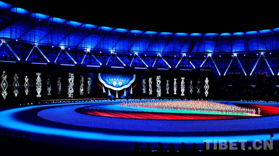 圖為第十二屆全國少數(shù)民族傳統(tǒng)體育運動會開幕式上,以各民族各地方的“錦繡”為主題的節(jié)目《融情匯聚》 攝影:劉莉
