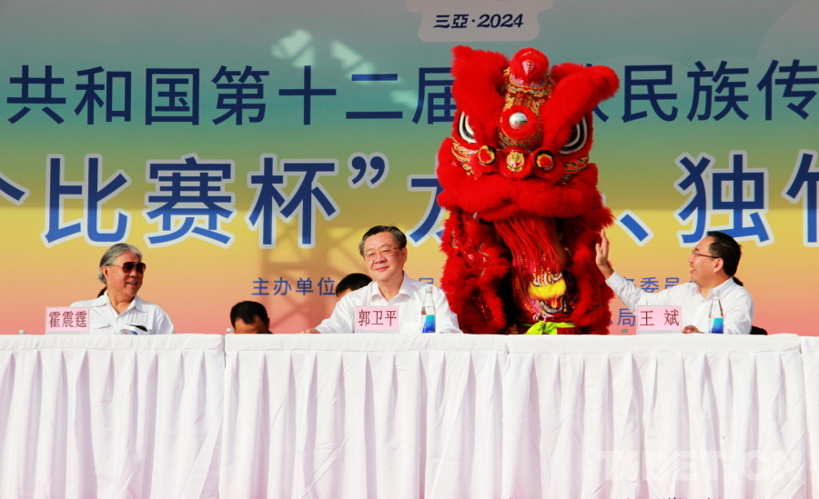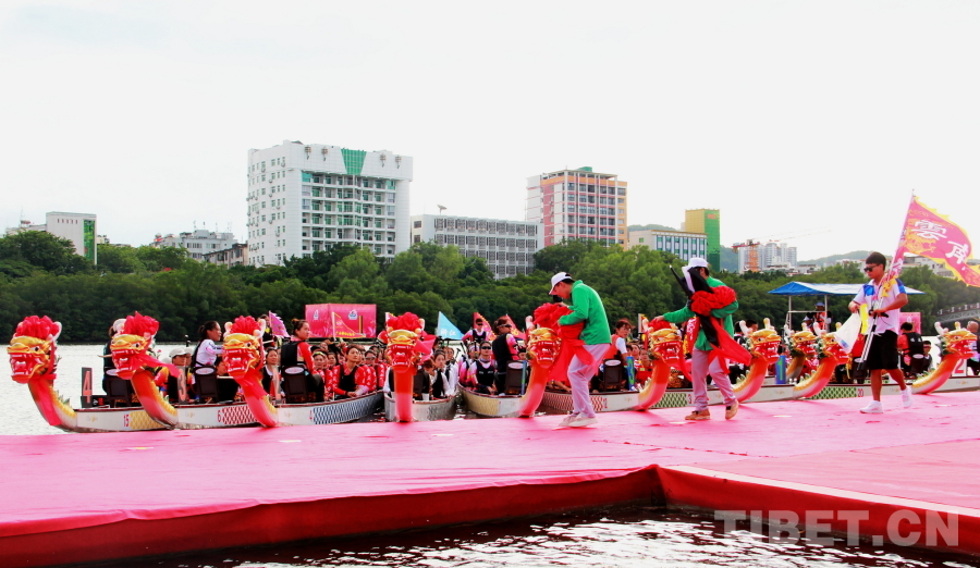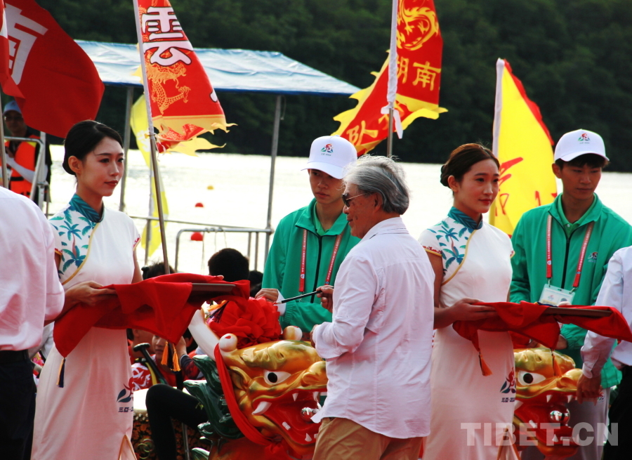 賽前,在龍舟巡游活動(dòng)后,國(guó)家民委副主任郭衛(wèi)平,海南省委常委、宣傳部部長(zhǎng)王斌,香港代表團(tuán)顧問、中國(guó)香港體育協(xié)會(huì)暨奧林匹克委員會(huì)會(huì)長(zhǎng)霍震霆,香港代表團(tuán)團(tuán)長(zhǎng),香港文化體育及旅游局體育專員蔡健斌,國(guó)家民委文化宣傳司司長(zhǎng)張謀,國(guó)家民委港澳臺(tái)辦公室主任魏國(guó)雄,海南省政府副秘書長(zhǎng)國(guó)章成,國(guó)家民委文化宣傳司副司長(zhǎng)張劍輝,國(guó)家民委港澳臺(tái)辦公室副主任趙靜,海南省民委副主任黎梁東,海南省旅文廳副廳長(zhǎng)王忠云,海南省三亞市政府副市長(zhǎng)張長(zhǎng)豐為龍舟點(diǎn)睛、披紅,將比賽氛圍烘托得格外喜慶熱烈。