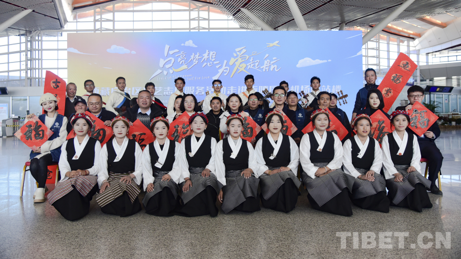活動現(xiàn)場,29名西藏文藝志愿者走進拉薩貢嘎國際機場航站樓,開展送“福”字、送“扎西德勒”、送春聯(lián)、扎木念彈唱等活動,為過往旅客和工作人員帶來了一場別開生面的文化體驗。