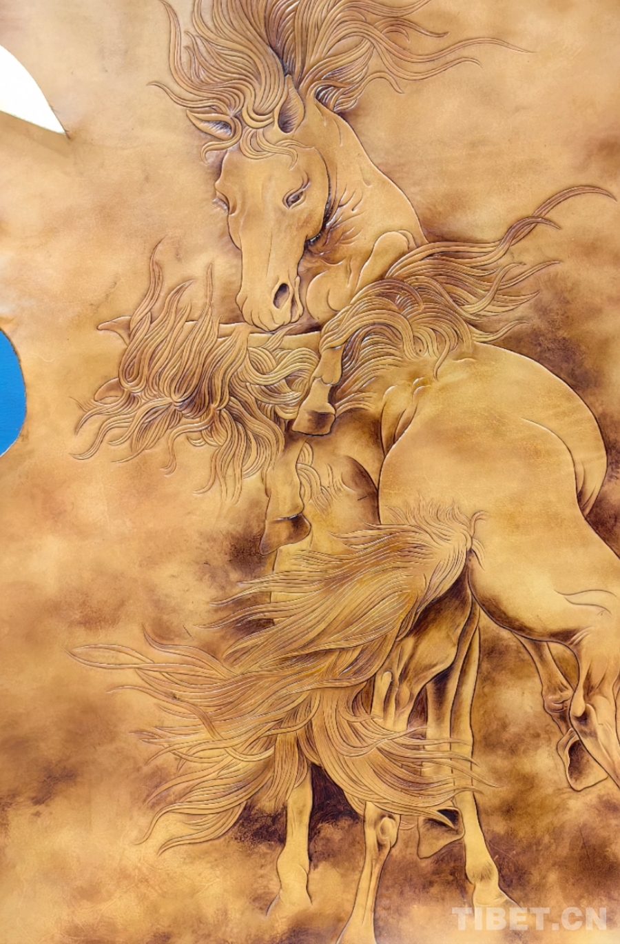 圖為多縣長江一號(hào)牧場參展的牛皮雕刻畫《青海雙驄》