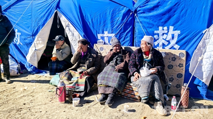 圖為定日縣曲洛鄉(xiāng)左措村安置點前,受災群眾在曬太陽 攝影:王淑