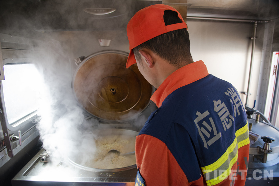 圖為山南市消防救援支隊消防員正在做餐食發(fā)放前的準(zhǔn)備 攝影:趙振宇