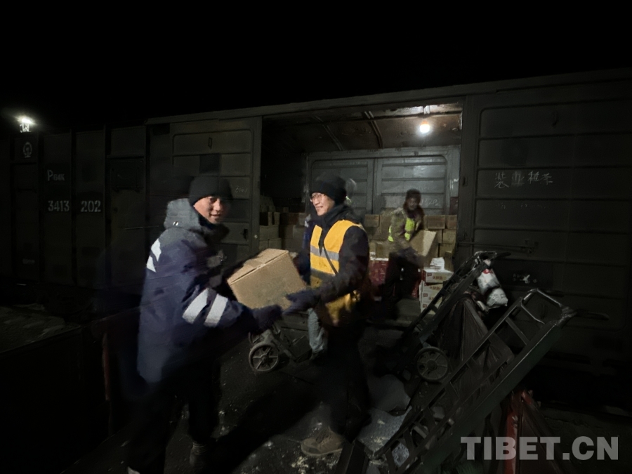 圖為首趟抗震救災物資專列抵達日喀則,工作人員爭分奪秒進行物資搶卸轉(zhuǎn)運 攝影:周悅翔 馬生明