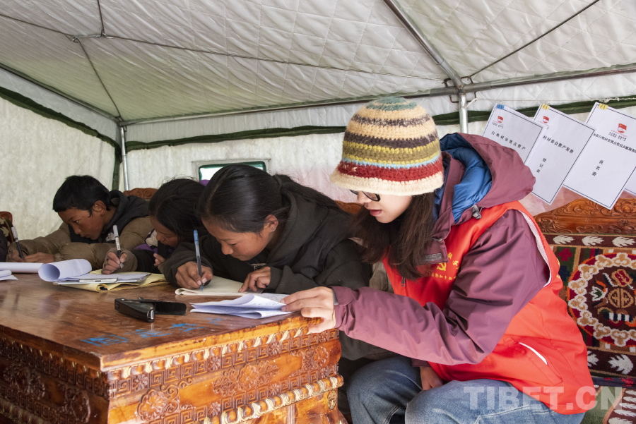 圖為次仁吉巴正在安置點輔導學生作業(yè) 攝影:趙振宇