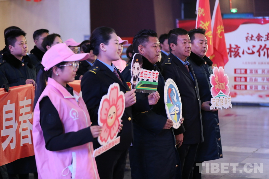 圖為拉薩車站春運(yùn)首日服務(wù)宣誓活動現(xiàn)場