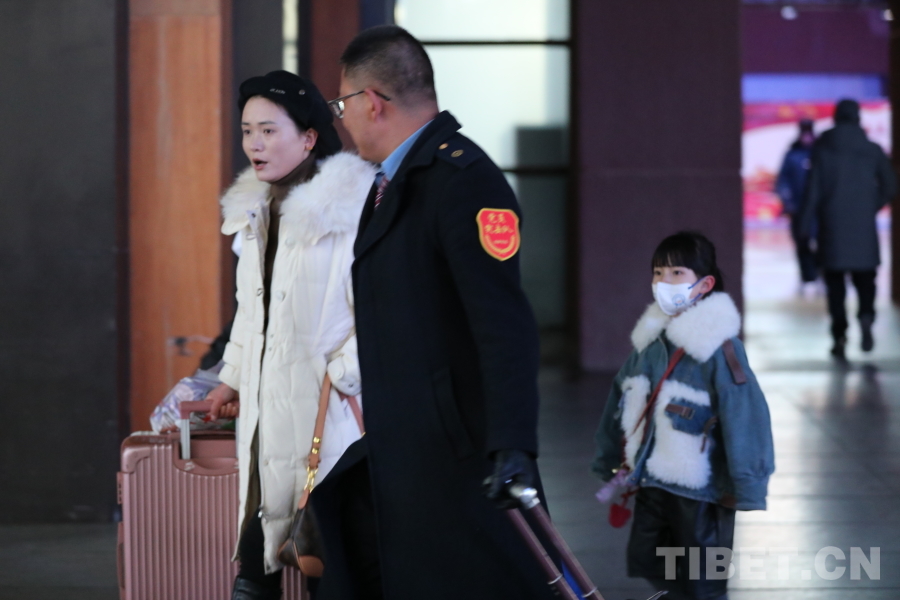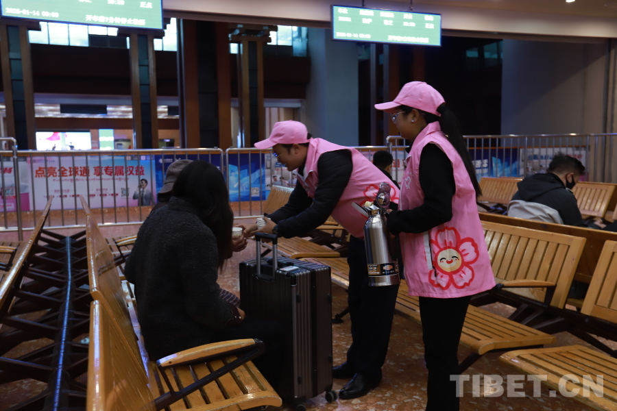 圖為拉薩車站春運(yùn)首日志愿者為候車旅客服務(wù)