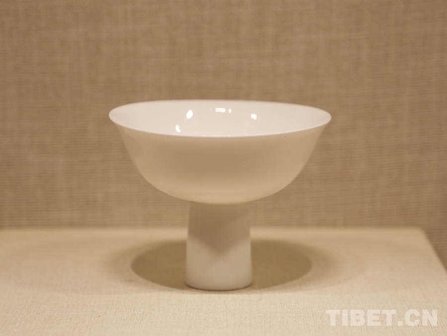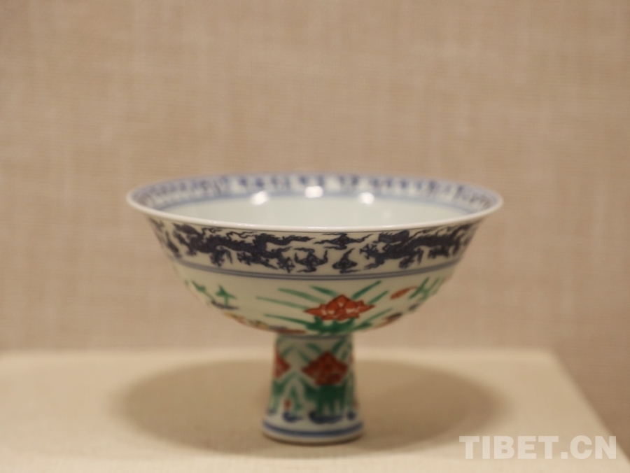圖為明宣德青花五彩蓮池鴛鴦紋高足碗。經(jīng)鑒定,這只內(nèi)沿書寫著藏文的高足碗是明代中央政府向薩迦寺賜送的實(shí)物見(jiàn)證 攝影:王茜