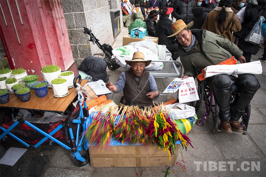普瓊,來(lái)自日喀則市江孜縣,在八廓商城南門前經(jīng)營(yíng)著自己的“羅薩梅朵”小攤。初見普瓊,我們被他沖著鏡頭的燦爛笑容所吸引。細(xì)細(xì)觀察,普瓊坐在地上的身高卻比別人矮了一大截?!拔覀儚睦_堆龍德慶的批發(fā)市場(chǎng)上買來(lái)這批‘羅薩梅朵’在此銷售,就希望能夠在年前的這段時(shí)間多賺些小錢補(bǔ)貼家用,所有人都想在新年之時(shí)過(guò)個(gè)充裕的‘好年’,不是嗎?”普瓊因一次意外高位截癱,失去雙腿的他并沒(méi)有消沉。他選擇積極面對(duì)生活,用自己的雙手和命運(yùn)抗?fàn)帲脠?jiān)強(qiáng)和勤勞讓自己和全家過(guò)上更好的生活。與普瓊不幸的經(jīng)歷相比,我們每個(gè)人過(guò)的每個(gè)年何嘗不都是一個(gè)個(gè)“好年”呢?普瓊對(duì)生活的那種熱愛(ài),對(duì)明天會(huì)更好的堅(jiān)定,何嘗不是我們對(duì)每一個(gè)“好年”所孜孜追求的呢?
