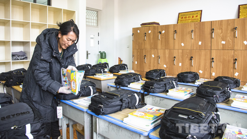 圖為定日縣措果鄉(xiāng)中心小學黨支部書記卓嘎正在為返校學生提前發(fā)放教材 攝影:趙振宇