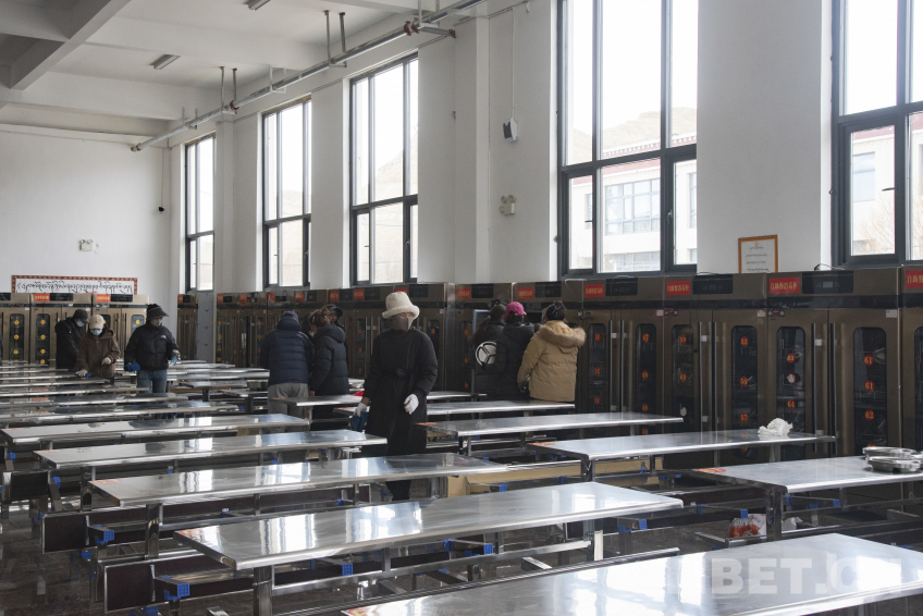 圖為長所鄉(xiāng)完全小學集中安置辦學點內新規(guī)劃的學生食堂,教職工們正在清理食堂衛(wèi)生。 攝影:趙振宇