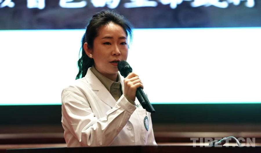 圖為四川省德陽市人民醫(yī)院宣傳部干事彭曉萌講述“范天勇援藏醫(yī)療服務(wù)隊”的援藏故事 攝影:劉莉