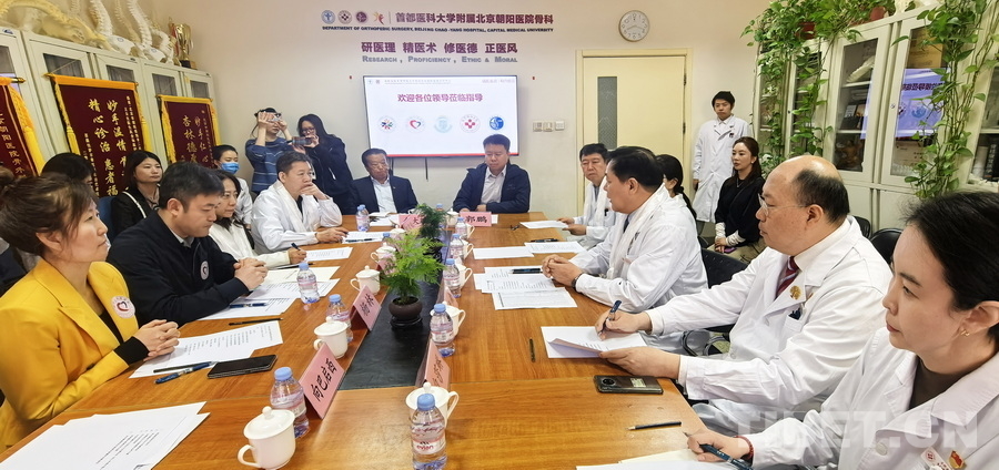 圖為北京朝陽醫(yī)院骨科團隊向“同心·共鑄中國心”組委會執(zhí)行主席金大鵬,北京朝陽醫(yī)院黨委書記、理事長紀智禮,北京朝陽醫(yī)院院長李海潮等介紹患兒病情、手術及恢復情況 攝影:劉莉