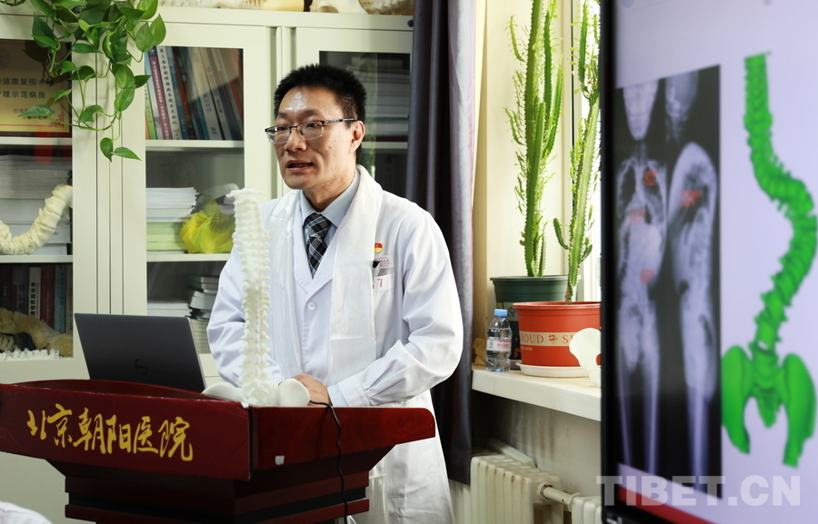 圖為北京朝陽醫(yī)院骨科主任、首都醫(yī)科大學骨外科學系主任、國際腰椎研究學會候任主席海涌介紹該院骨科團隊在救治高海拔地區(qū)脊柱側(cè)彎患者方面所做的工作 攝影:劉莉