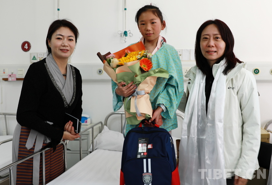圖為北京啟明星辰慈善公益基金會理事長王海瑩(右一)與四川省甘孜州石渠縣衛(wèi)健局副局長向巴啟西(左一)向在北京朝陽醫(yī)院接受救治的四川省甘孜州石渠縣脊柱側(cè)彎患兒贈送鮮花與學習用品 攝影:劉莉