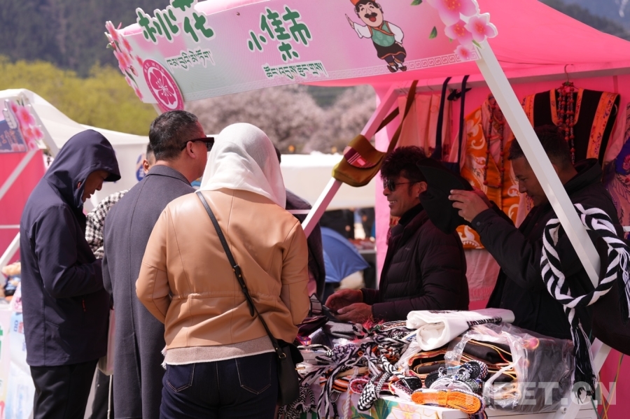沿著蜿蜒的小路,一邊是錯落有致的桃花樹,一邊是特色集市?!斑@些是工布男女服飾、這是馬套、這是藏式包包……都是我們合作社的工作人員手工制作的?!痹谖枧_一旁的桃花小集市,林芝市巴宜區(qū)絲綢藏裝定制農(nóng)牧民專業(yè)合作社負(fù)責(zé)人尼瑪扎西正向游客一一介紹自家展銷點(diǎn)的產(chǎn)品以及其背后的文化和制作過程。經(jīng)過一番討價(jià)還價(jià),一千余元的“大單子”順利成交,游客將一件件精美的巴宜“小禮品”裝進(jìn)袋子和尼瑪扎西揮手告別。