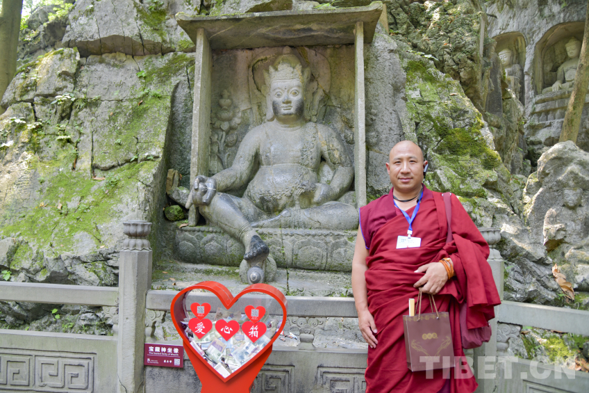 “雖然我已經在飛來峰講解了許多年,但始終不知道這尊藏傳佛教財神爺在藏語中的發(fā)音怎么讀,今天有幸向各位請教。”在靈隱寺飛來峰的理公塔旁,一處坐南朝北、呈縱長形的佛龕內供奉著一尊菩薩坐像,這是元代所雕刻出的藏傳佛教黃財神造像。隨團導游小李正趁此機會向來自西藏的師生們請教,來自西藏的他們亦同樣為在杭州能看到如此大規(guī)模的藏傳佛教造像感到驚訝。