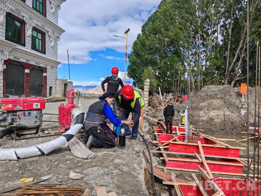 在仲康村巴桑家的重建工地上,工程已進入鋼筋捆扎階段。一場突如其來的夜雨導致基坑積水。清晨七八點,施工隊員已在基坑中忙碌開來,有的加緊捆扎鋼筋,有的尋找水泵抽水。日頭漸高,汗水浸濕了工人們的額頭,他們卻無暇休息。這時,阿媽巴桑提著一壺剛煮好的甜茶走來,就地一杯杯沏好,熱情地招呼這群“小伙子”?!耙郧暗睦戏孔诱饓牧?,現(xiàn)在黨和政府給我們建更好的新房子,日子肯定越過越有盼頭!”樸實的話語里,滿是她對未來的憧憬和對援助的感激。