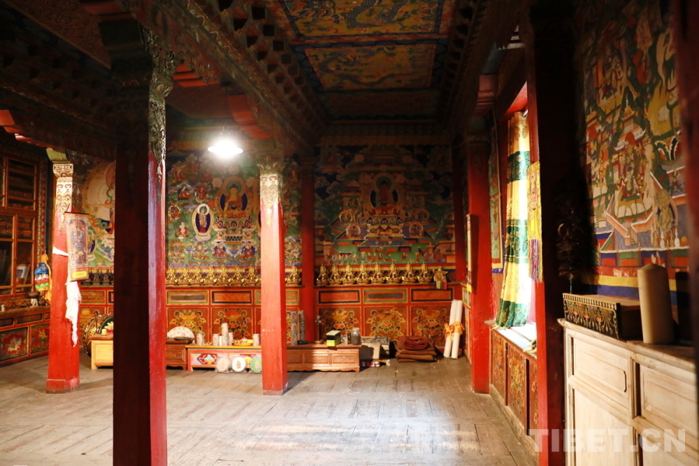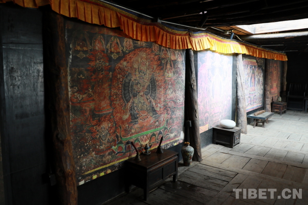 宗薩木府最驚艷的是其經(jīng)堂中歷經(jīng)380余年歷史仍色彩絢麗、保存完整的整堂壁畫。新中國成立后,宗薩木府曾被收歸公有,許多無房的當?shù)刎毨罕姳话才抛∵M了這里?!拔母铩睍r期,宗薩木府的經(jīng)堂被作為村里的倉庫,人們用報紙糊住壁畫,使這些藝術(shù)珍品沒有受到“破四舊”的影響。