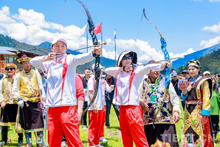 圖為奧運冠軍同當(dāng)?shù)卮迕褚煌w驗西藏傳統(tǒng)體育項目工布響箭