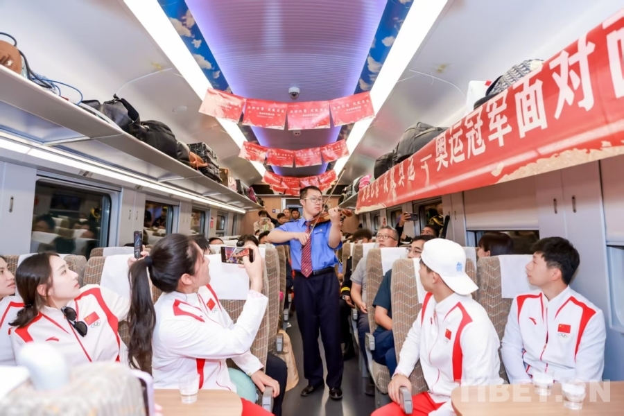 圖為奧運冠軍走進(jìn)林芝火車站