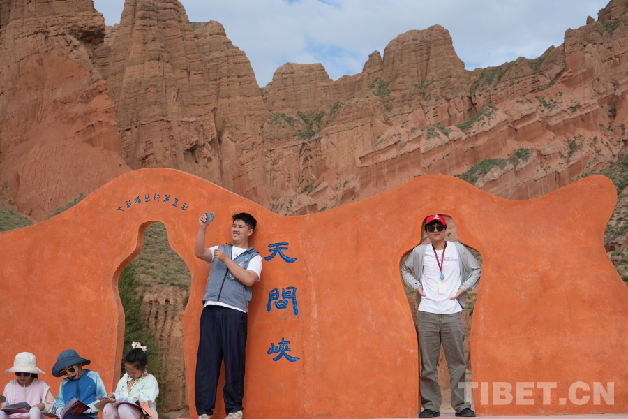 圖為胡俊賢(右二)在貴德國家地質(zhì)公園拍照留念 攝影:鄒慧