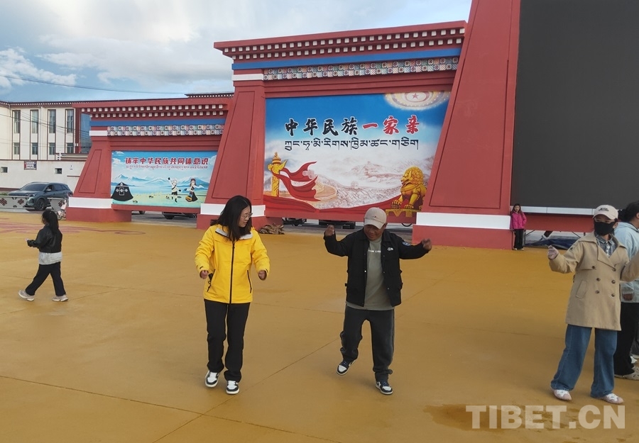 圖為在尼瑪縣民族團(tuán)結(jié)進(jìn)步主題廣場,筆者向扎西索朗學(xué)跳鍋莊舞 攝影:昂翁洛布