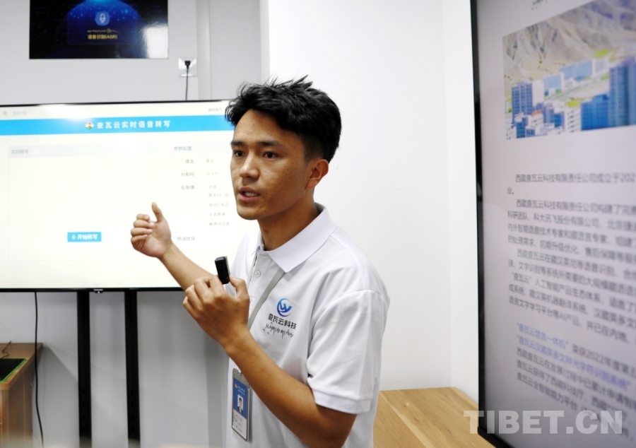 圖為西藏查瓦云科技有限責(zé)任公司副總經(jīng)理次仁桑珠介紹查瓦云實時語音轉(zhuǎn)寫系統(tǒng) 攝影:劉莉