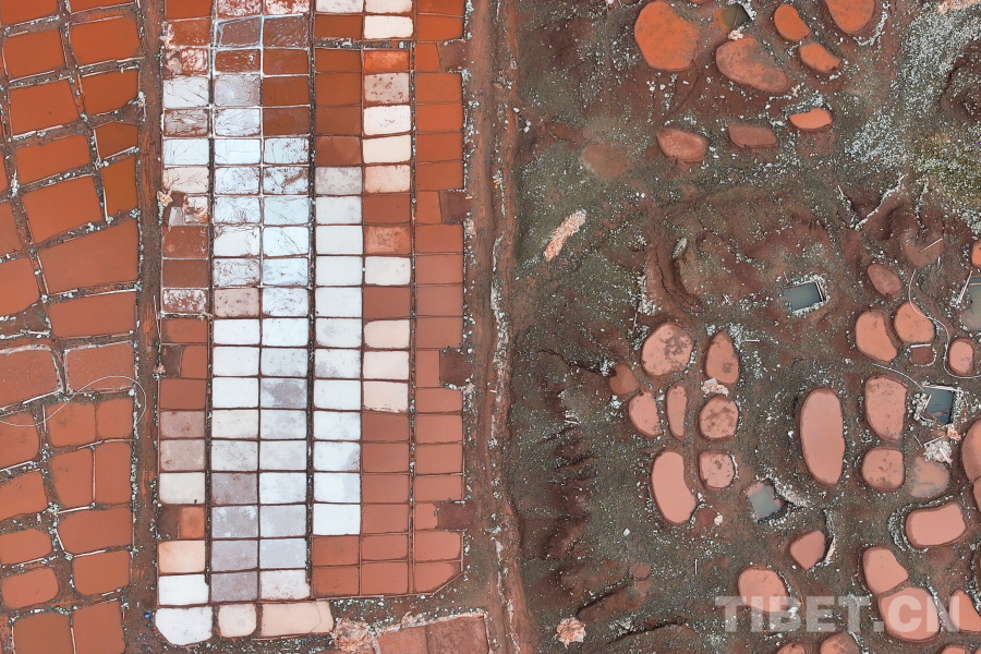 圖為航拍白扎鹽場,這種紅褐色的顏色來自附近山體中所含的礦物質(zhì) 攝影:薛蒂