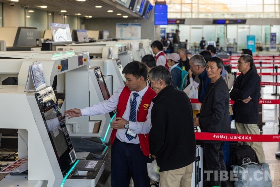 圖為機(jī)場(chǎng)志愿者幫助旅客辦理手續(xù) 民航西藏自治區(qū)管理局供圖