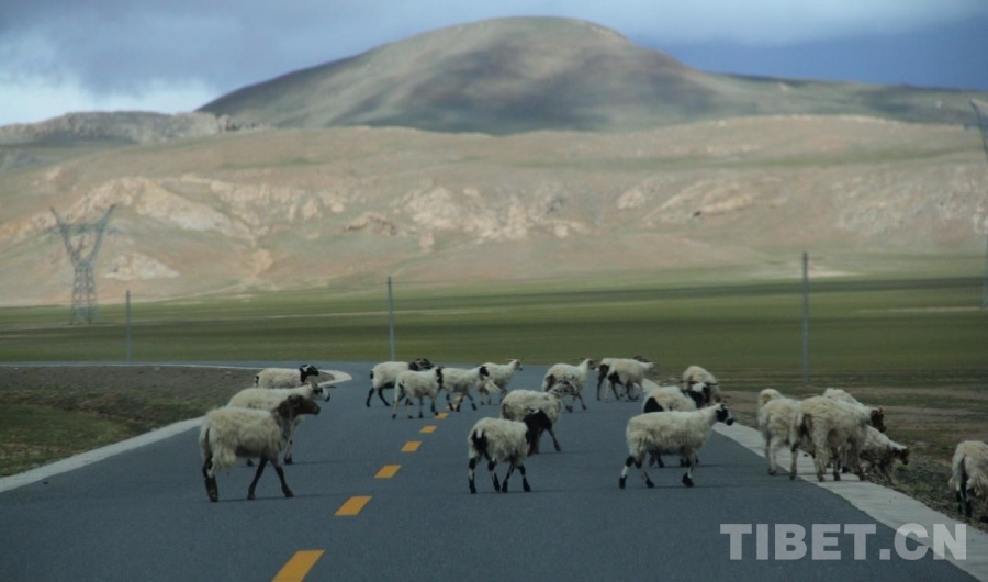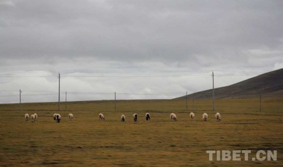 圖為從班戈到雙湖的路兩邊有大片草場,牛羊在悠閑吃草 攝影:趙釗