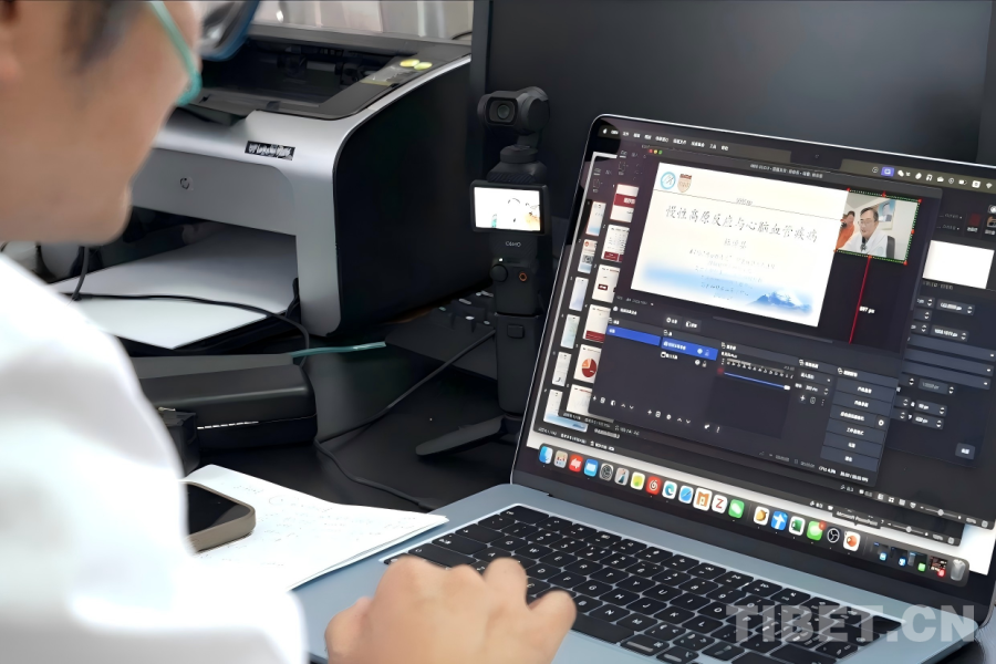 在阿里地區(qū)人民醫(yī)院的行政樓辦公室內(nèi),來自上海華山醫(yī)院神經(jīng)外科、作為第25批“博士服務(wù)團(tuán)”成員援藏的主治醫(yī)師杜倬嬰,正專注研究一項“新技術(shù)”。桌面上,一臺口袋相機(jī)運行著,旁邊電腦屏幕上同步顯示相機(jī)所拍攝的畫面,同時呈現(xiàn)的還有一份關(guān)于高原反應(yīng)與心腦血管疾病的課程講義?!斑@是一套直播系統(tǒng),不過我現(xiàn)在還在學(xué)習(xí)怎么使用?!爆F(xiàn)任阿里地區(qū)人民醫(yī)院黨委委員、副院長的杜倬嬰笑著展示初見雛形的成果。