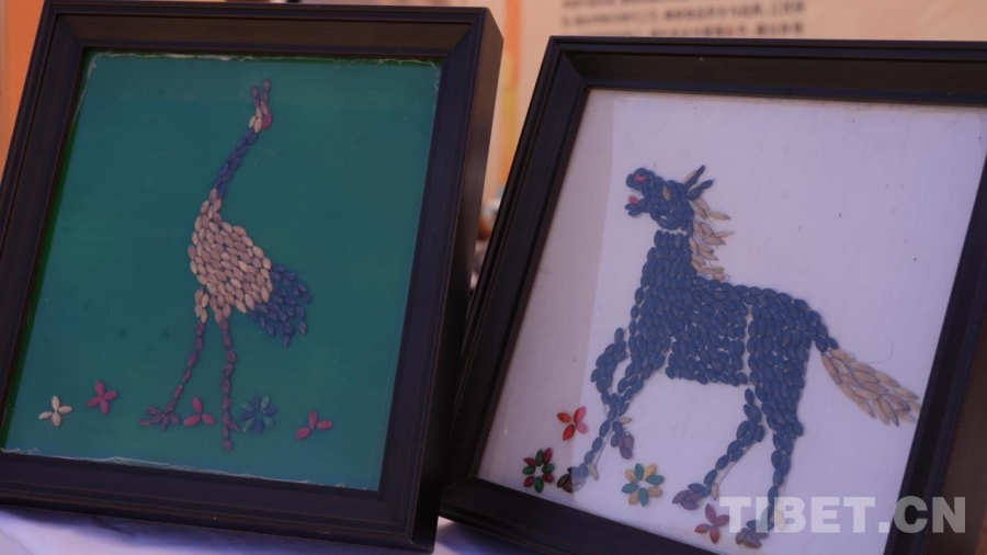 圖為林周縣籮曾繪畫工作室負責人仁青多吉用青稞粒創(chuàng)作的文創(chuàng)產(chǎn)品