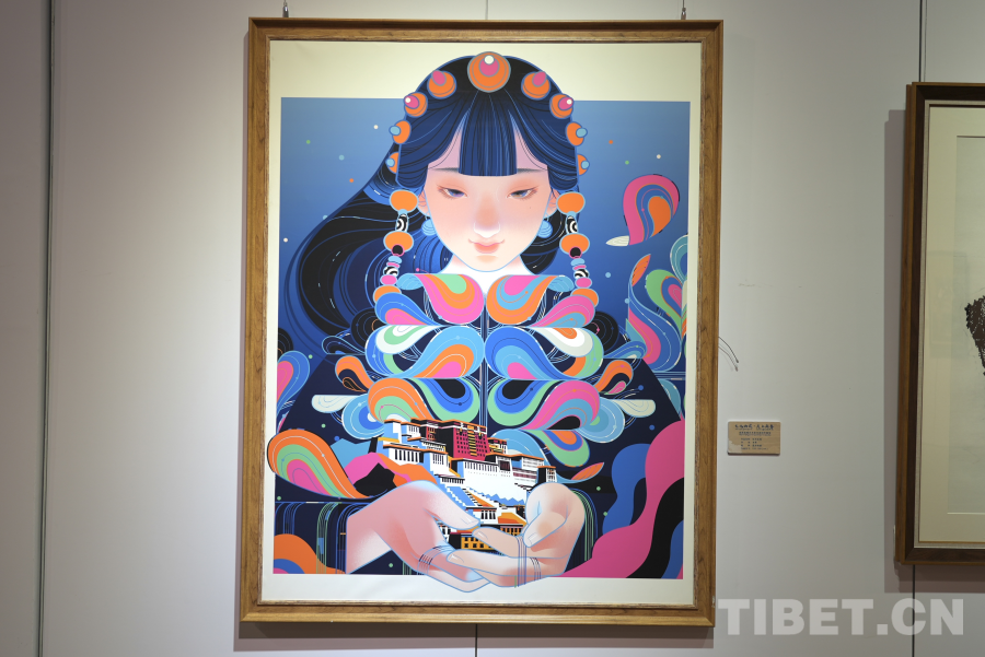 展覽現(xiàn)場(chǎng),參展藝術(shù)家李旻的作品《虹光圣城》色彩絢麗,構(gòu)思新穎,引得眾多觀眾駐足觀看。據(jù)介紹,本幅作品是一副綜合運(yùn)用了現(xiàn)代藝術(shù)創(chuàng)作手段的數(shù)字繪畫,同時(shí)融入了如布達(dá)拉宮、藏裝等經(jīng)典的藏式元素,畫面生動(dòng),色彩鮮艷,形式新穎,展現(xiàn)了當(dāng)代西藏藝術(shù)的傳承與創(chuàng)新,是本次展覽極具代表性的作品之一。