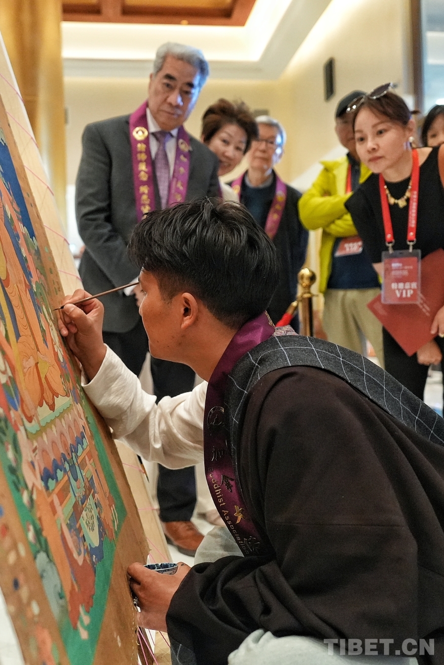 為了提升觀展體驗,展覽特別設置了“唐卡技藝現場演示”環(huán)節(jié)。壤巴拉非遺傳習協(xié)會青年藝術家申支足現場展示傳統(tǒng)唐卡繪制過程,他專注而細膩的筆觸,讓觀眾得以近距離觀察到非遺技藝的“匠心細節(jié)”,直觀感受每一幅作品背后所沉淀的時間與文化心血,從而更深入地理解中國優(yōu)秀傳統(tǒng)藝術的創(chuàng)作邏輯。