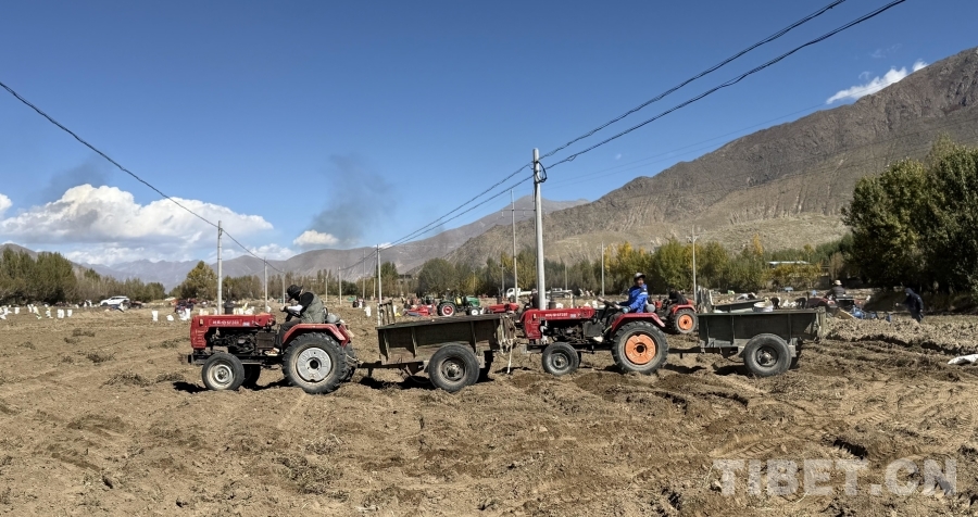 圖為南木林縣艾瑪鄉(xiāng)山巴村村民正在使用機(jī)械收獲土豆