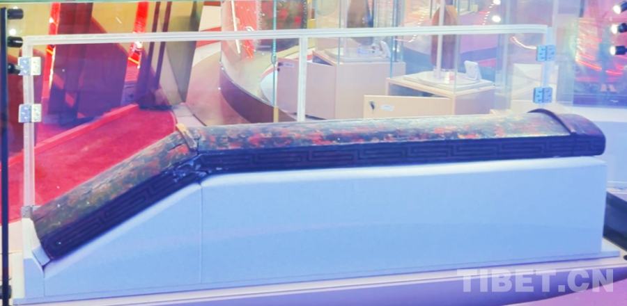 我們看到,雖然歷經(jīng)千年,琴與長(zhǎng)鼓仍色澤鮮艷,保存完好。整體呈亞腰形,兩端配備皮帶,可系于腰間,長(zhǎng)鼓中間最細(xì)窄之處可系繩便于安置在樂(lè)器架上。其表面精巧地髹飾著朱漆與黑漆,巧妙地描繪出寶相牡丹花、云頭紋和火焰紋。而擁有同樣花紋的木琴一端斜下折出鈍角,更見(jiàn)巧思。雖然木琴兩道岳山間原本的琴弦因年代久遠(yuǎn)沒(méi)有了,但我們?nèi)苑路鹉芟胂蟮剑氩睾蟮难葑嘀?,琴弦聲聲,有長(zhǎng)安的溫婉綿長(zhǎng),也含雪域的雄渾遼闊,鼓聲陣陣,中原的節(jié)奏與雪域的韻律交織,和鳴穿越時(shí)空,在當(dāng)下奏出和諧樂(lè)章。這兩件公主的嫁妝,早已不是單純的器物,更承載著深厚的歷史文化底蘊(yùn),成為民族文化交融的鮮活注腳。