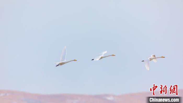 大天鵝翱翔在藍(lán)天?!∪魻柹w縣融媒體中心供圖 攝