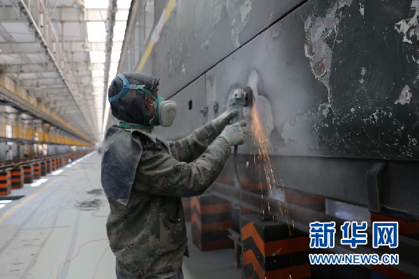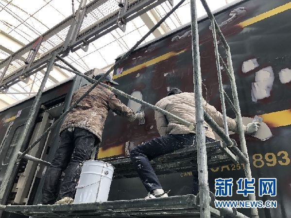 工人在對列車進(jìn)行外皮打磨作業(yè)。新華網(wǎng)發(fā)
