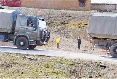 車(chē)隊(duì)行駛途中,沿線藏族兒童向軍車(chē)敬禮。干亞?wèn)| 攝